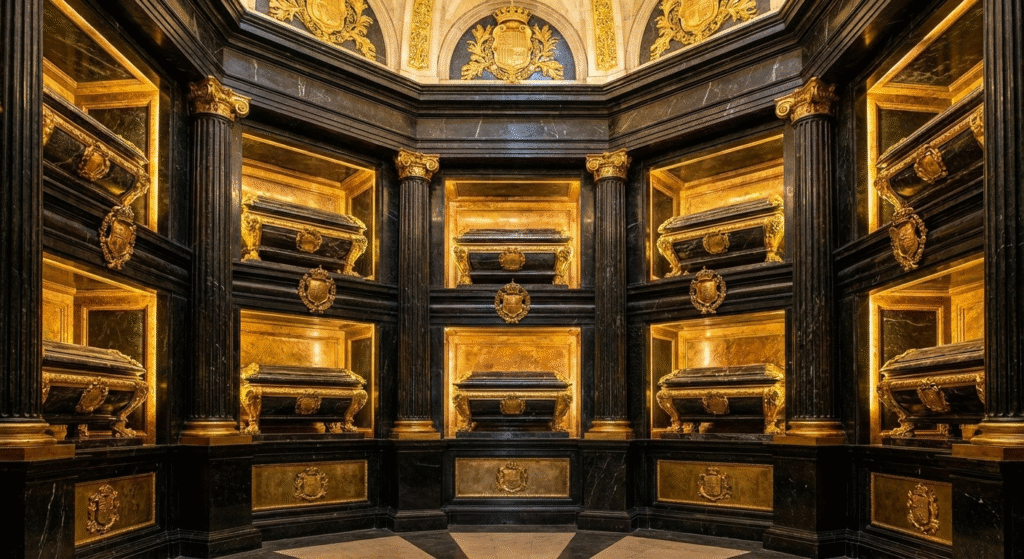 You descend stairs into an octagonal chamber beneath the basilica’s main altar. The walls are lined with gilded bronze and black marble sarcophagi containing the remains of Spanish monarchs and queens who were mothers of kings.