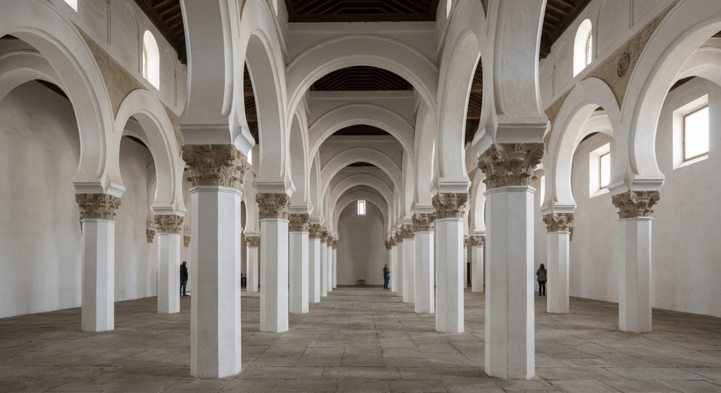 The interior is stunning – white horseshoe arches creating a forest of columns, blending Islamic architectural style with its Jewish origins. The peaceful, elegant space feels timeless.